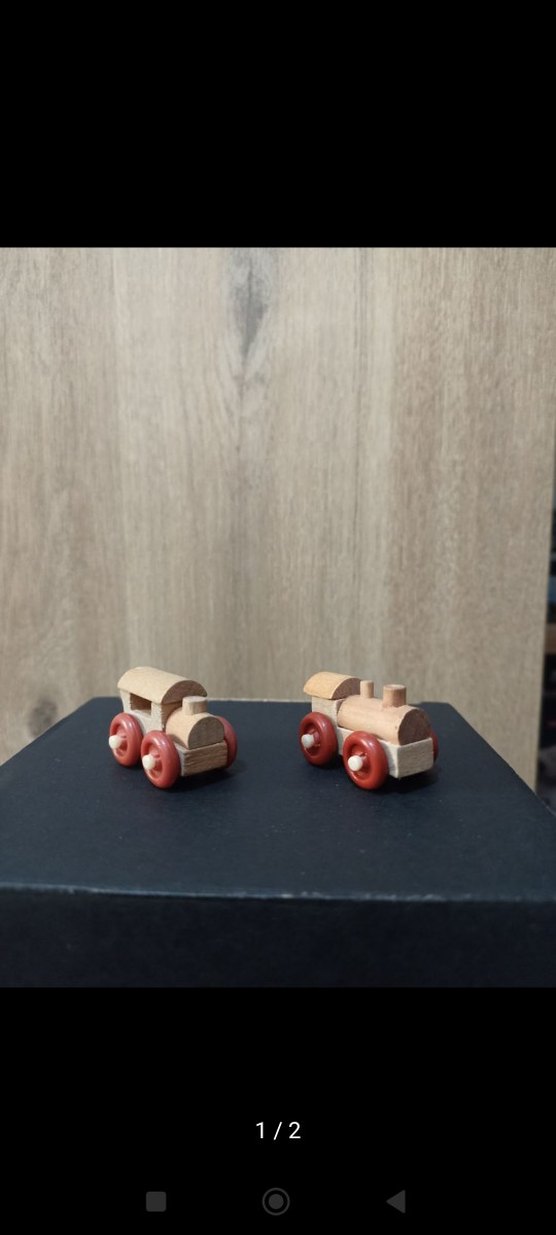Kırmızı tekerlekli, renkli iki adet ahşap oyuncak araba, sade ve pürüzsüz tasarıma sahip.