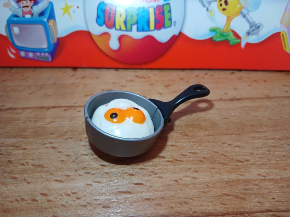 Turuncu ve beyaz yumurta şeklinde tasarıma sahip küçük gri mini tava oyuncak. Oyun mutfakları için uygun.