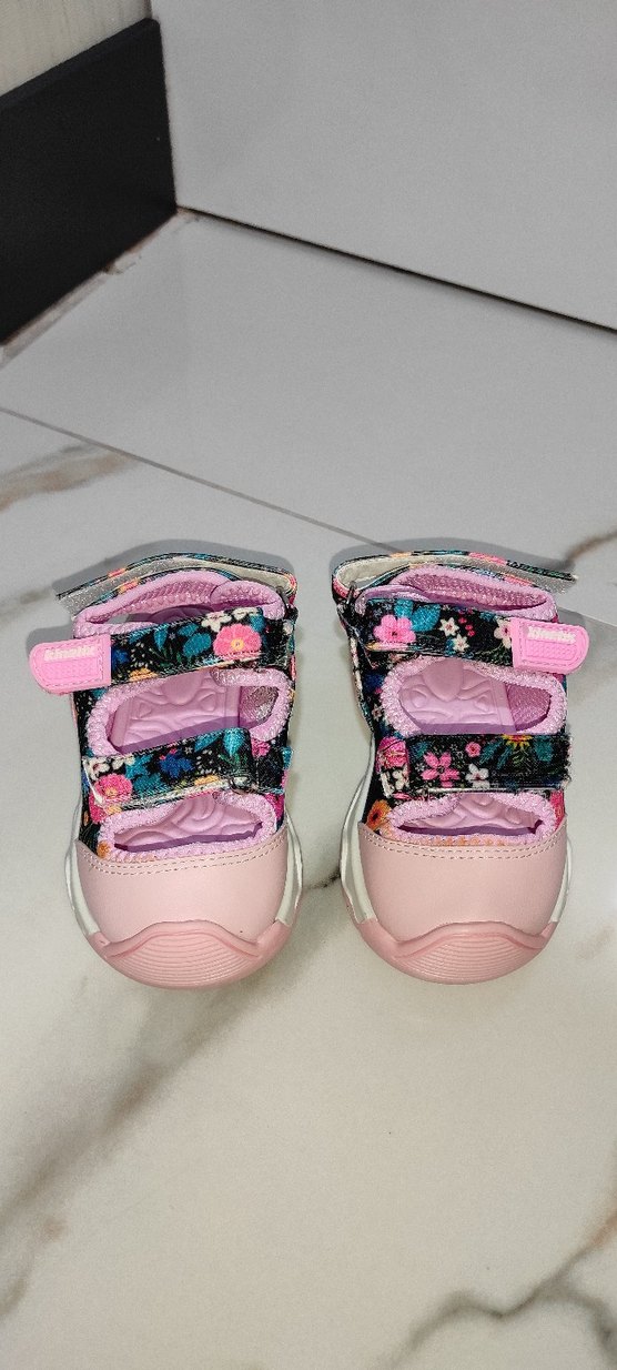 Pembe renkli, çiçek desenli kız çocuk spor ayakkabısı, kaymaz kauçuk taban ve kolay açılıp kapanan cırt cırtlı bantlara sahiptir.