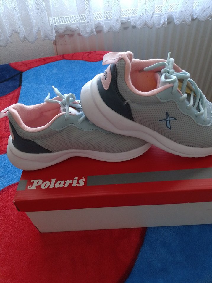 Polaris gri kadın spor ayakkabısı, baskılı desen, cırt cırtlı kapanış ve sivri topuklu tasarıma sahiptir. Spor için kauçuk tabanlıdır.