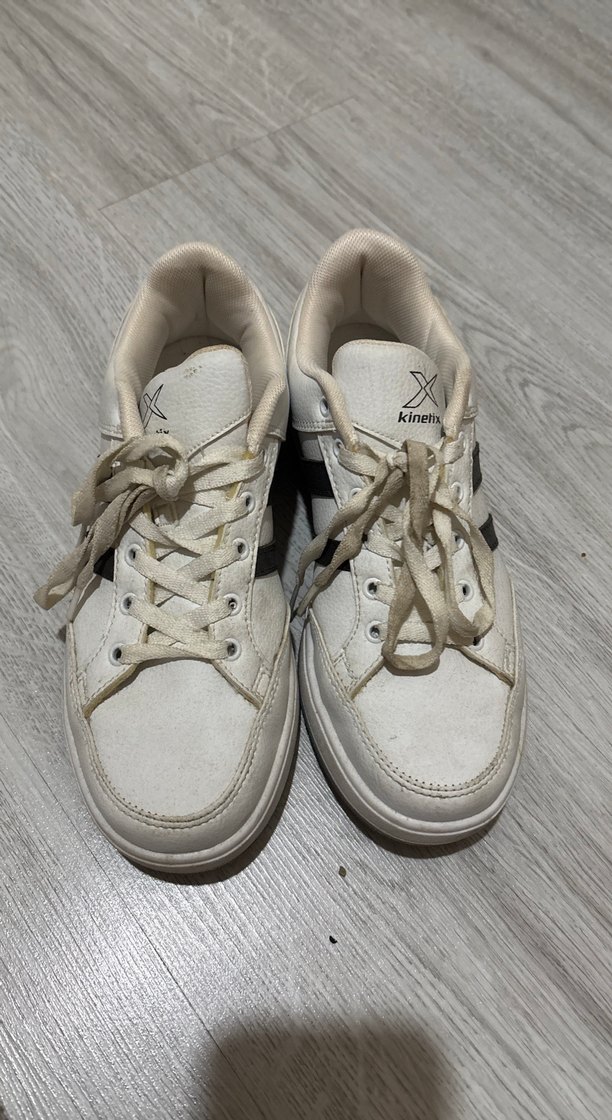 Kinetix markalı, bağcıklı, düz tabanlı beyaz kadın spor ayakkabısı. Spor ve günlük sokak stiline uygun, gri tonlarda detaylara sahip.