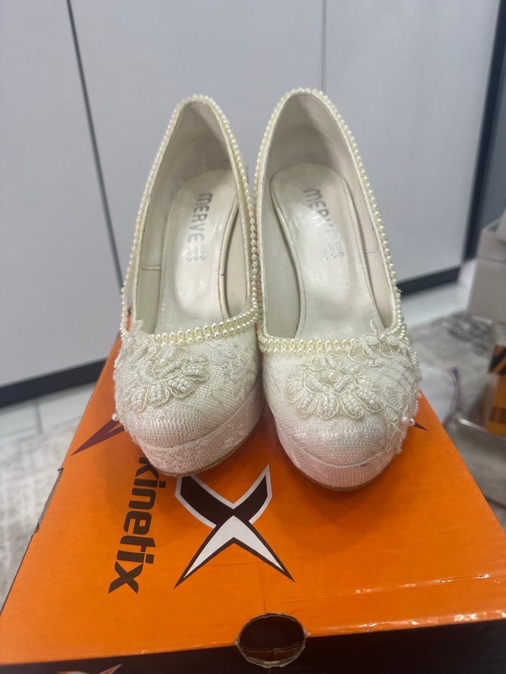 Gelinlik ayakkabım beyaz dantel işlemeli ve dolgu topuklu kadın ayakkabısı. Lastik tabanıyla düğün gibi özel günlere uygundur. Çok rahat
