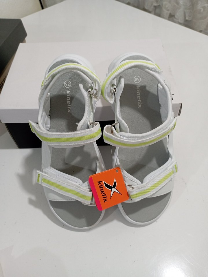 Kinetix beyaz erkek spor sandalet, Velcro bantlı, baskılı tasarım ve kauçuk malzemeden üretilmiş, açık hava için uygun, trend athleisure stilinde.