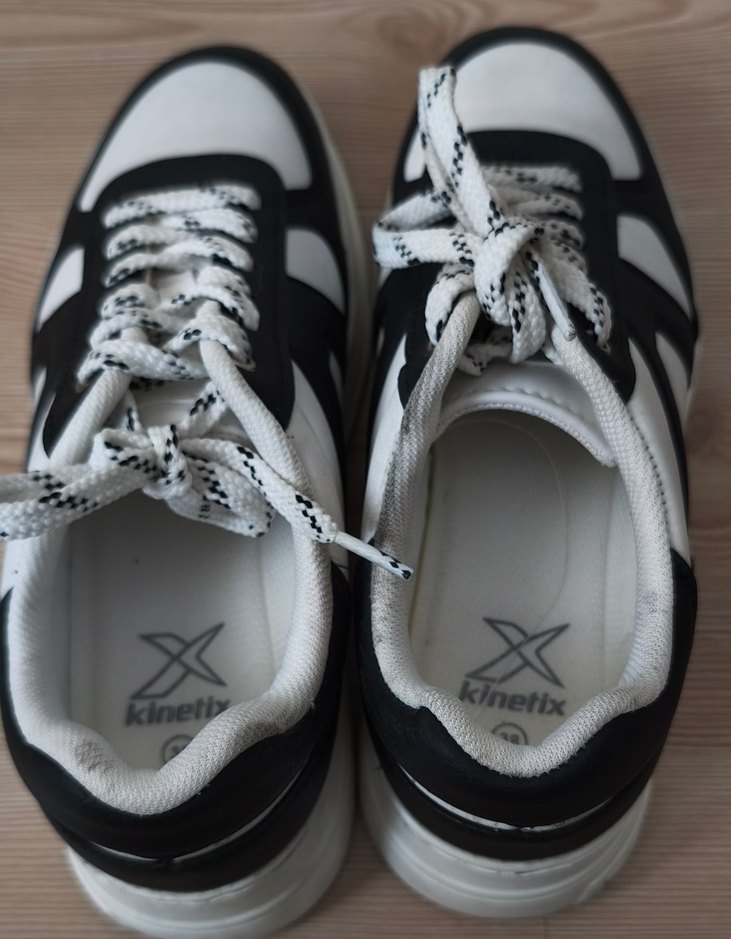 Kinetix marka kadın spor ayakkabısı, beyaz ve gri çizgili tasarıma, lastik tabana ve bağcıklı kapamaya sahiptir. Platform topuklu, sportif ve sokak stiline uygundur. 1 kere giyildi ayağına küçük geldiği için satıyorum