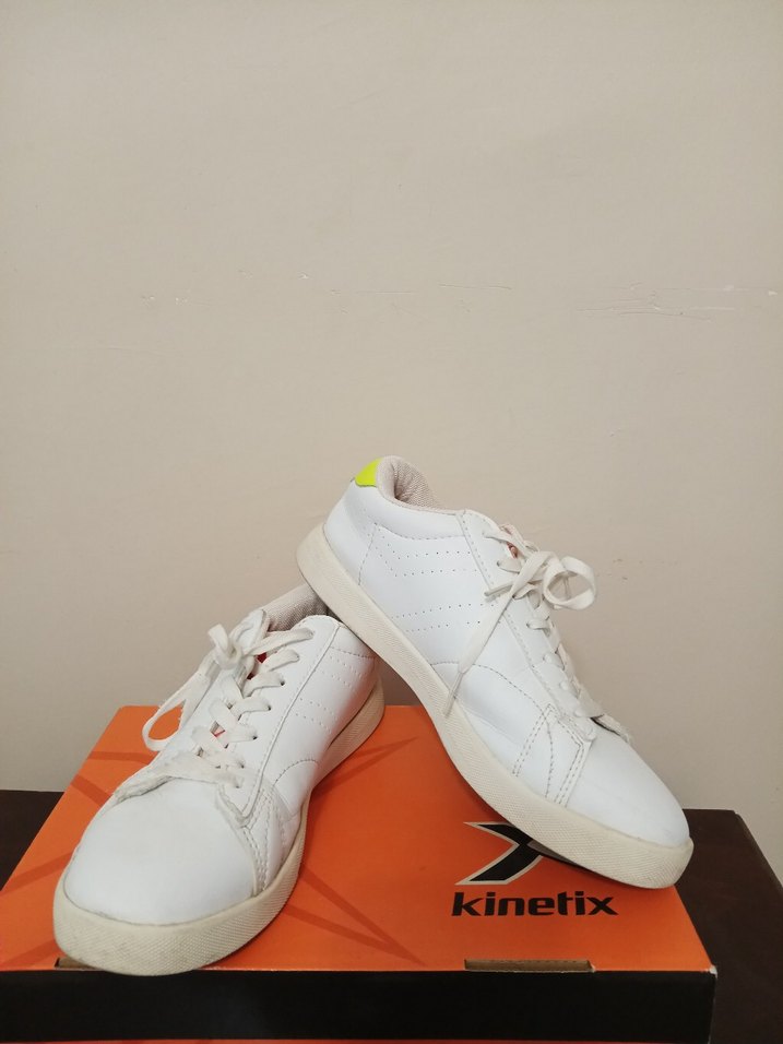 Kinetix markalı, beyaz kadın spor ayakkabısı, stiletto topuklu ve cırt cırt detaylı, kauçuk malzemeden. Spor ve sokak stiline uygun, renkli dokunuşlu.