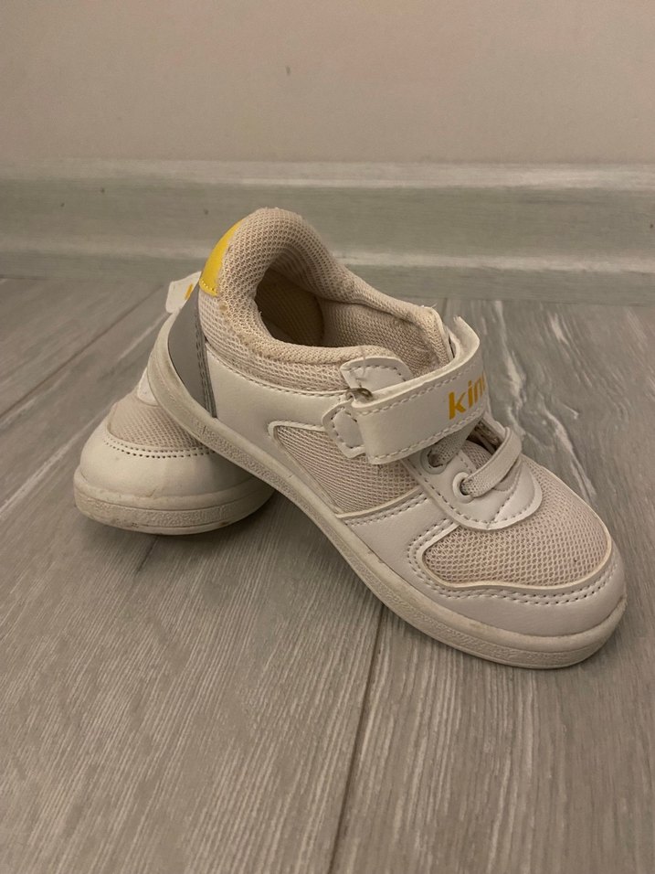 Beyaz renkli, cırt cırtlı k çocuk spor ayakkabısı. Kauçuk tabanlı, gri detaylı, sade ve günlük stil için uygundur.