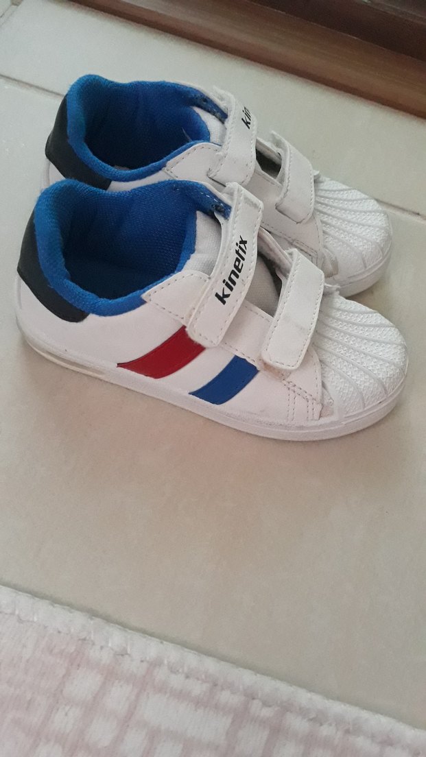 Kinetix marka, beyaz tabanlı, kırmızı ve mavi çizgili, cırt cırtlı, kauçuk tabanlı erkek çocuk spor ayakkabısı. Trendy casual sneaker.