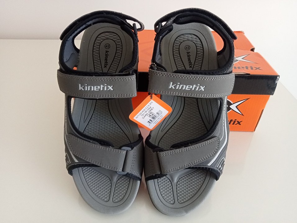 Gri renkli Kinetix erkek spor sandalet, ayarlanabilir cırt cırtlı bantlar rahat kullanım sağlar. Orijinal, sıfır etiketli ürün.