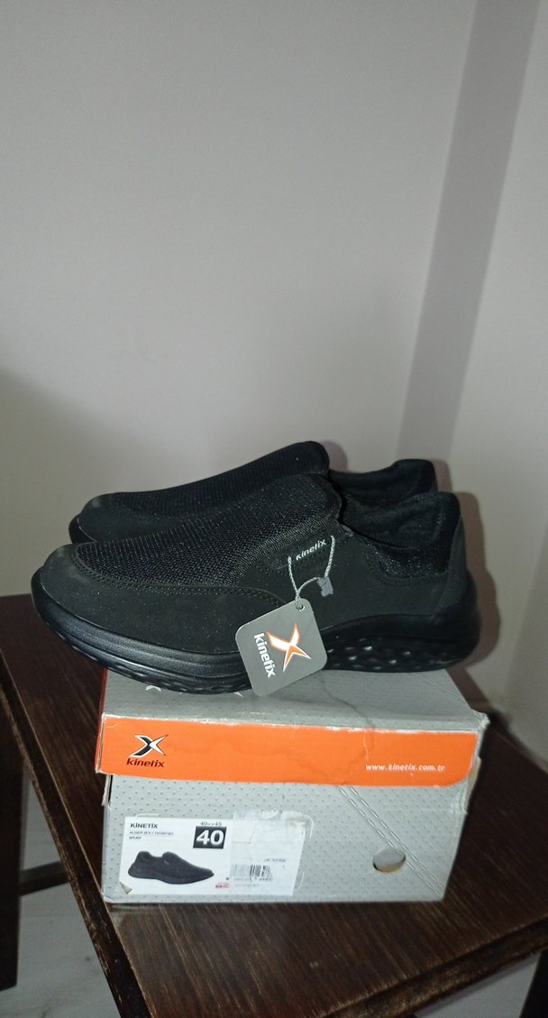 Kinetix markasının siyah erkek spor ayakkabısı, baskılı desen ve cırt cırtlı kapanışa sahip. Kauçuk malzeme kullanılmış, 40 numara.