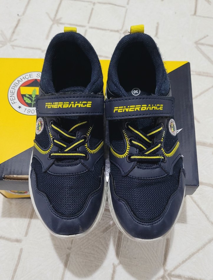 Fenerbahçe baskılı, sarı lacivert renkli, cırt cırtlı ve kauçuk tabanlı erkek çocuk spor ayakkabısı. Fotoğraflarda görüldüğü gibidir. 30 numaradır. Kutusu ile gönderim yapılacaktır.
