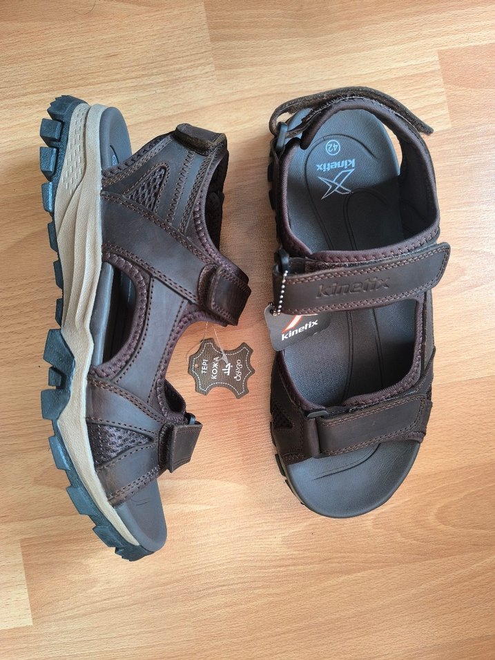 Kahverengi kayışlı, kauçuk malzemeden yapılmış erkek outdoor sandalet. Sokak tarzına uygun, rahat ve şık bir model. Kinetix marka hakiki deri 42 numara etiketi üstünde kahverengi cırt cırtlı sandalet.