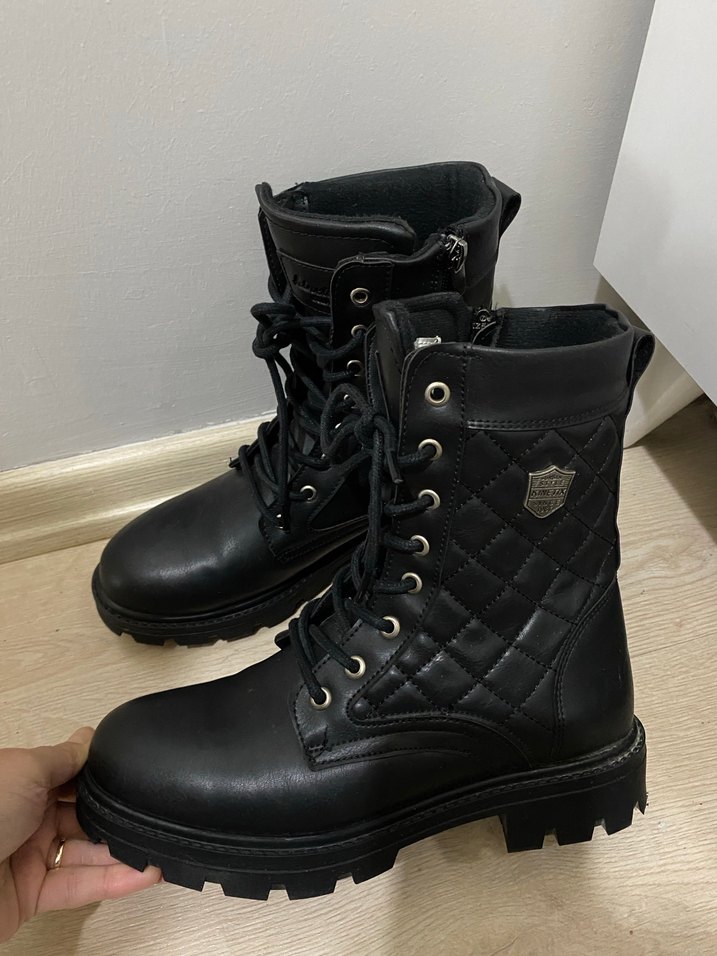Siyah deri biker bot, kalın topuklu ve tokalı detaylara sahip, yanları kapitone desenlidir. Trendy rahat stil için uygundur. Yenidir fazlalıktan satıyorum hiçbir sorunu yok mağazadan almış gibidir. Orjinaldir.