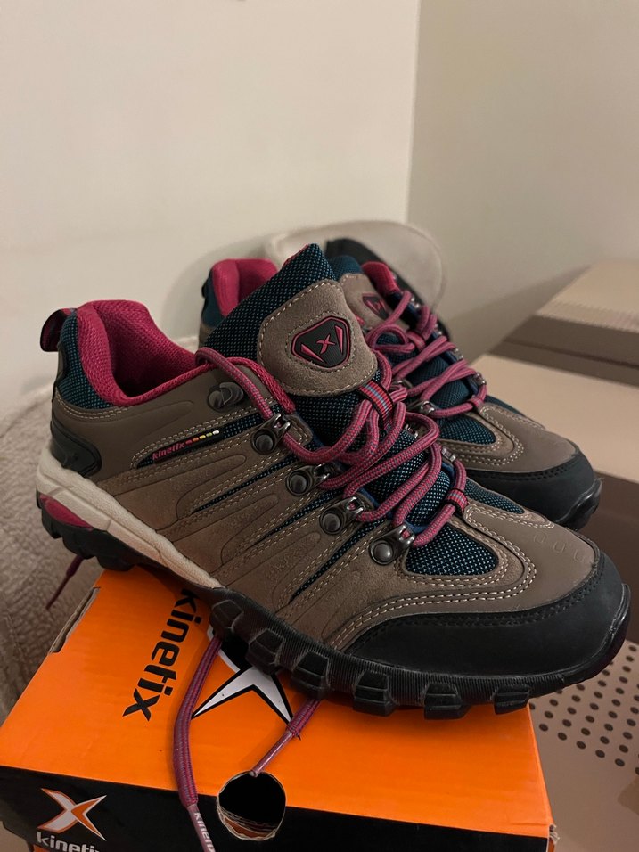 Kinetix markalı, koyu kahverengi desenli, bağcıklı ve kauçuk tabanlı kadın outdoor ayakkabısı, 1-2 kez kullanıldı
