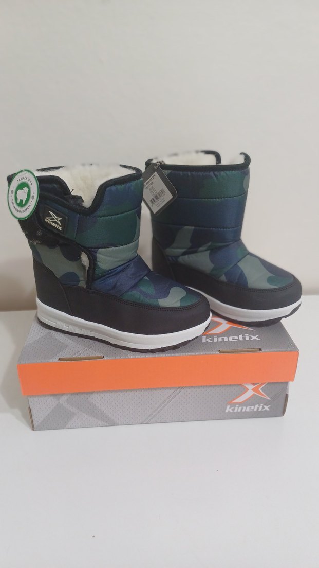 Kinetix markalı, içi hakiki koyun yünü,kamuflaj desenli, koyu yeşil renkli kauçuk erkek çocuk botları. Kolay giyim için cırt cırtlı kapanışa sahip, sokak modası tarzında.
