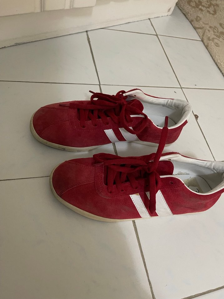 Kırmızı süet malzemeden yapılmış, topuksuz kadın spor ayakkabısı. Rahat ve şık, günlük kullanım için uygun.