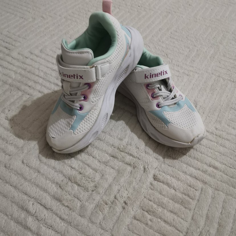 Kinetix markalı, beyaz tabanlı, pastel tonlarda tie-dye desenli, elastik yapılı kız çocuk spor ayakkabısı. Kaymaz kauçuk tabanlı, sokak stiline uygun.(burun kisminda kucuk bir kusur var. Resimde de gorunuyor zaten)