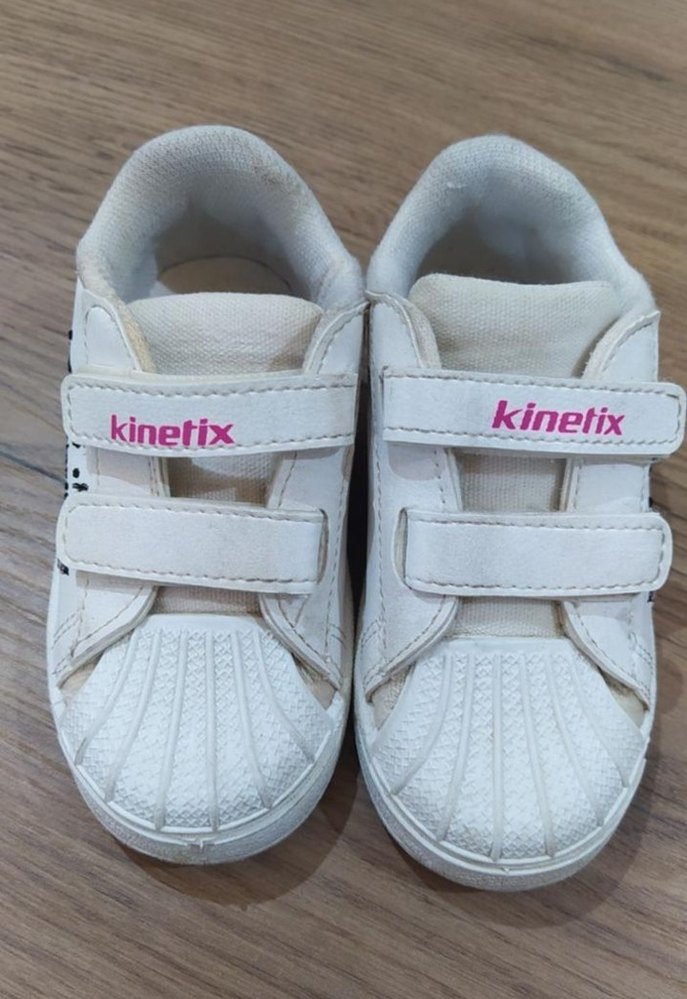 Kinetix markalı, beyaz renkli kız çocuk spor ayakkabısı, baskılı detaylı ve kauçuk tabanlıdır. Cırt cırtlı kapanışı kolaylık sağlar.