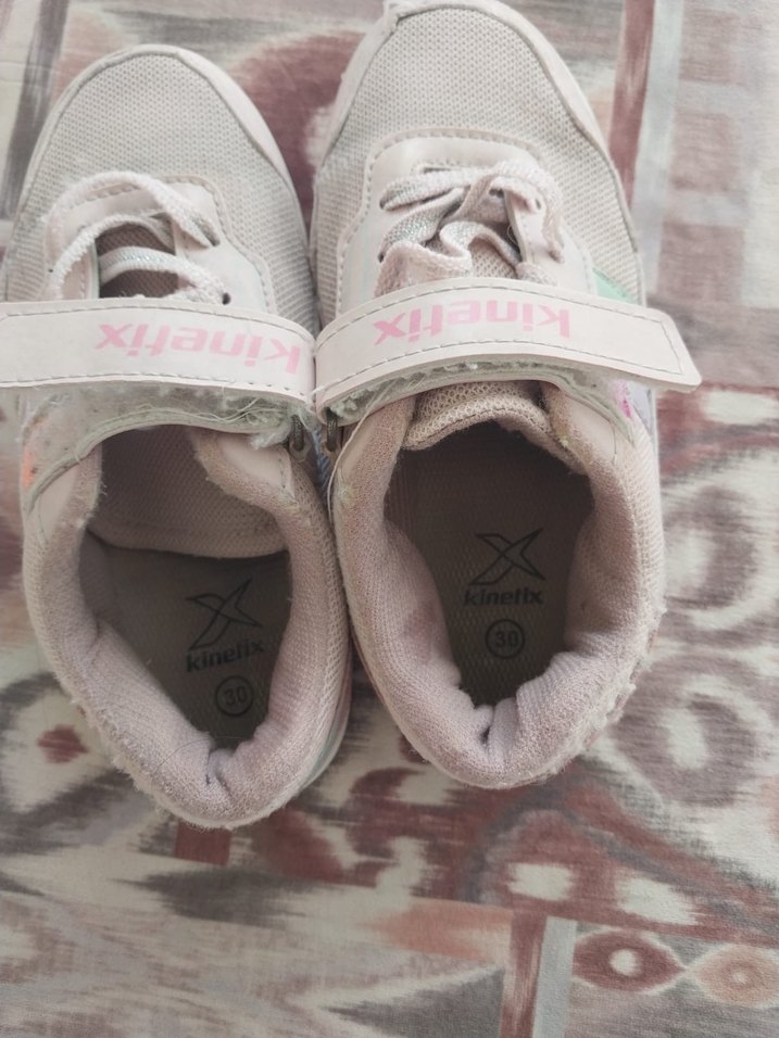 Kinetix marka kız çocuk spor ayakkabısı, gri ve pembe renklerde baskılı tasarıma sahip. Kolay giyimi sağlayan cırt cırtlı bant ve kauçuk tabanlıdır.