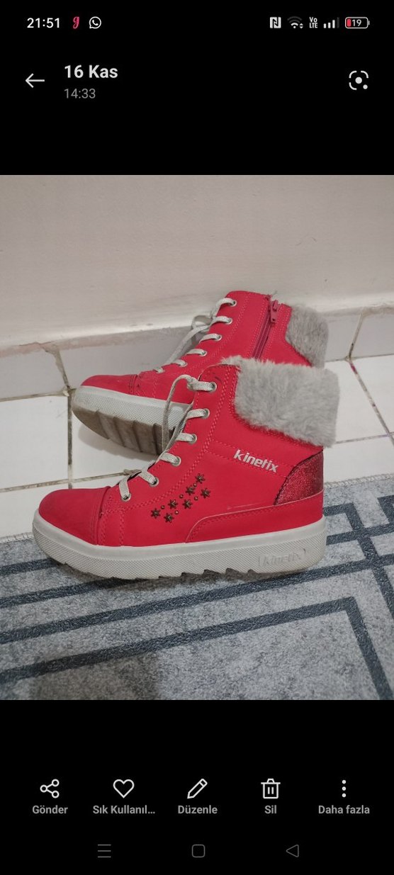Kinetix markalı, kürklü detaylı, yan fermuarlı, baskılı kırmızı kız çocuk botu. İç kısmı yumuşak ve sıcak tutan kumaşlıdır.