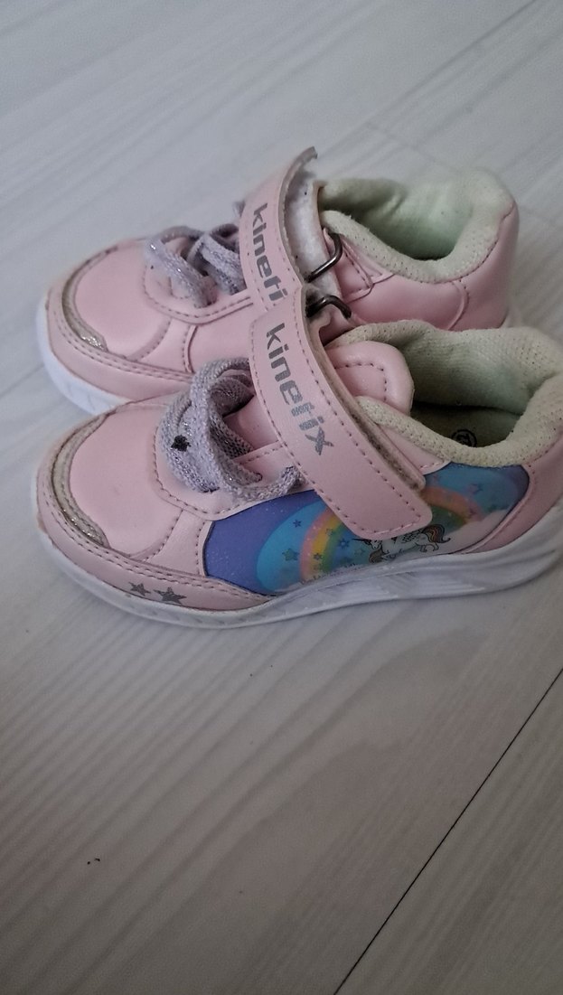 Pembe, pastel tonlarda bağcıksız, tokalı, lastik tabanlı kız çocuk spor ayakkabısı. Bağcıksız tasarımı ve renkli desenleriyle rahat kullanım sunar.