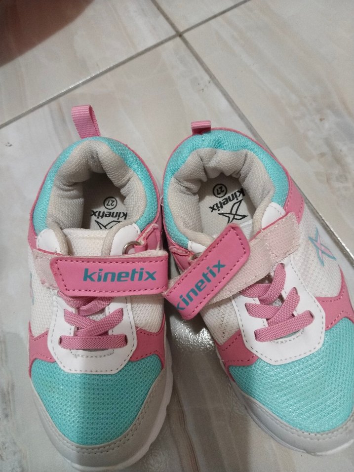 Kinetix kız çocuk spor ayakkabısı, renkli baskılı ve pembe-mavi-beyaz tonlarda. Kauçuk tabanlı ve kolay kapanan cırt cırtlıdır.