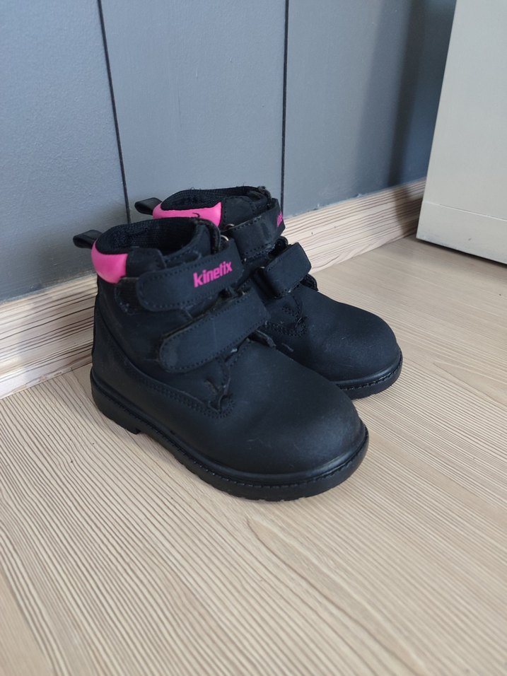 Kinetix markalı, koyu renkli kauçuk kız çocuk botları, pembe detaylar ve kolay kapanan cırt cırtlı bantlarla normcore ve rock punk tarzında.