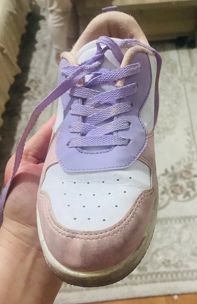 Kız çocuk spor ayakkabısı, lila pastel renk ve tie-dye desenli. Bağcıklı, kauçuk tabanlı, şık ve rahat sokak stili için uygun. Sorunsuz