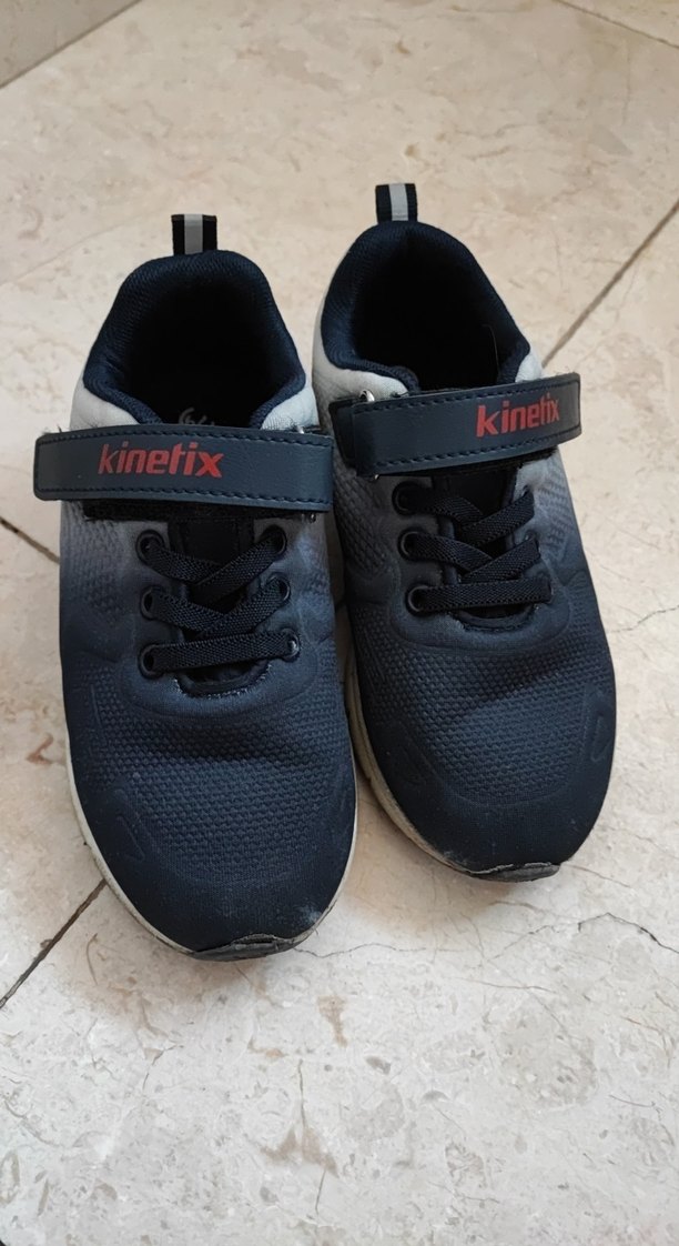 Kinetix marka, koyu lacivert baskılı erkek çocuk sneaker ayakkabı, cırt cırtlı ve kauçuk tabanlıdır, trend sokak stili için uygundur. Işıklı olup az kullanılmıştır.