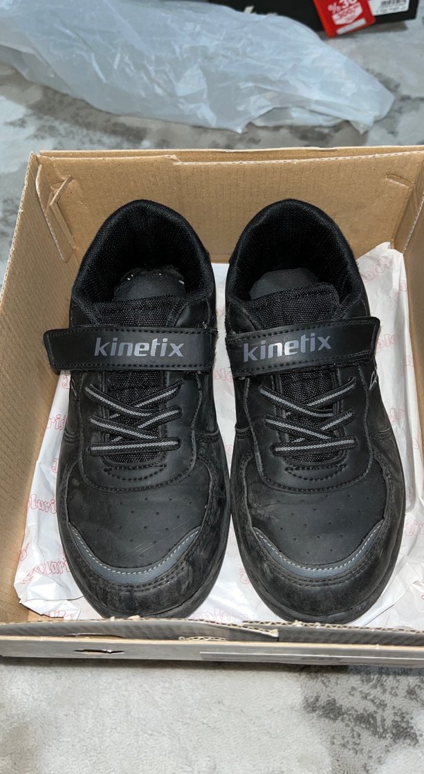 Kinetix markalı, cırtcırtlı, kauçuk tabanlı siyah erkek çocuk spor ayakkabısı, baskılı desenli ve rock punk tarzı sokak giyimine uygun.