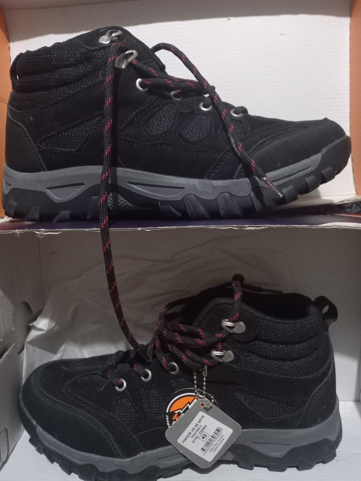 Siyah renkli, baskılı desenli erkek outdoor botları, bağcıklı ve dayanıklı kauçuk tabanlıdır. Sokak stili ve günlük dış mekan kullanımı için uygundur.