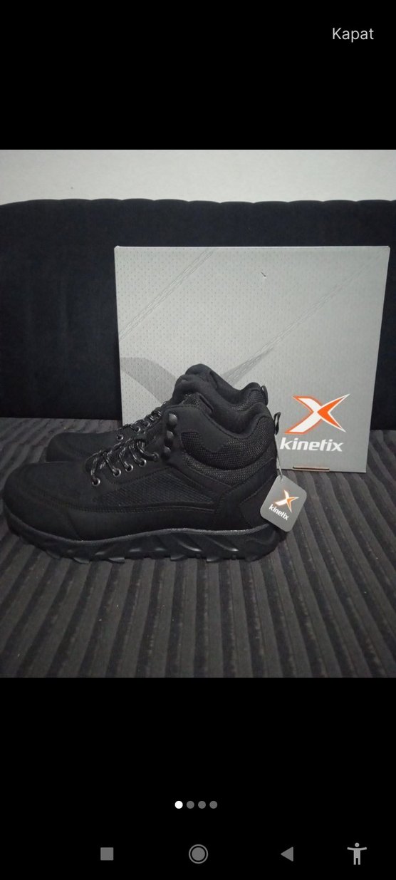 Kinetix markalı siyah erkek outdoor bot, dayanıklı kauçuk taban ve baskılı kemer detayına sahip, sportif sokak stili için uygun.