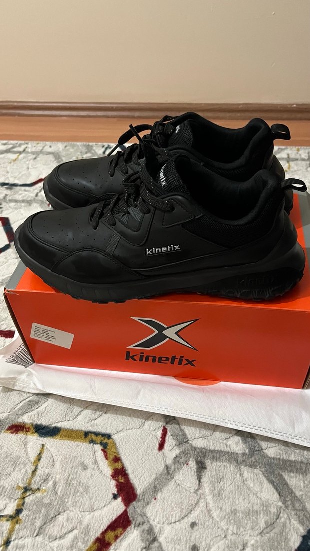 Kinetix markalı siyah erkek spor ayakkabısı, baskılı detaylı ve velcro bantlıdır. Kauçuk tabanlı, sokak stili ve spor için uygundur. Kinetix 42 numara Outdoor&Günlük siyah deri ayakkabı sıfır ayarında 1 aylık faturalı ürün,farklı ayakkabı aldığım için satılık bir kaç kez giyildi çok rahat yumuşak tabanlı ayakkabı.
