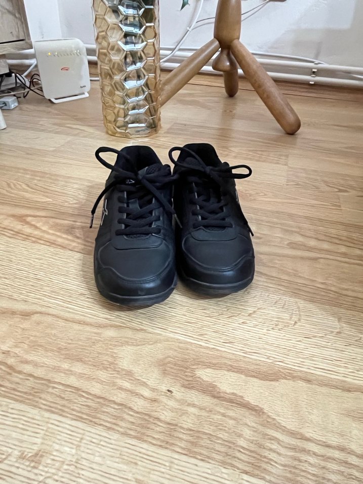 Siyah, spor ayakkabısı. Desensiz tasarıma sahip temel model. Temiz az kullanılmış