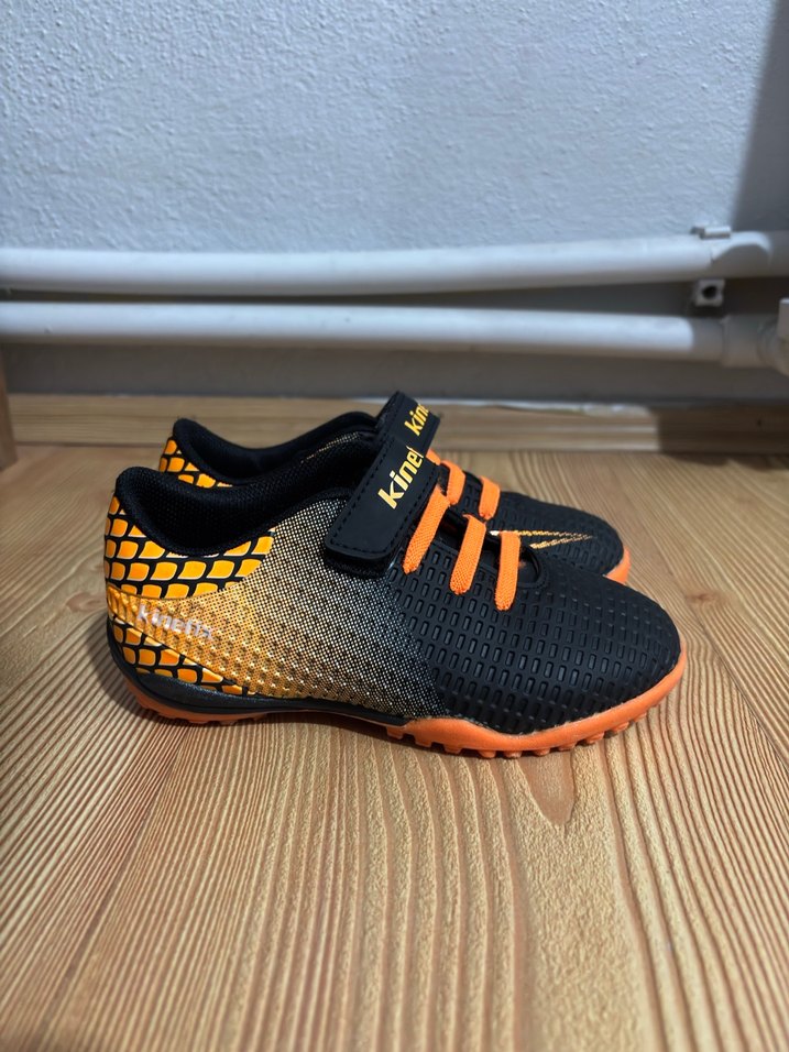 Turuncu yılan desenli, kaymaz kauçuk tabanlı ve cırt cırtlı erkek çocuk spor krampon