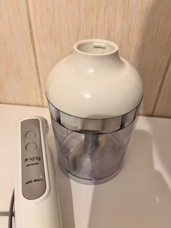 King markalı beyaz ve gri renkli doğrayıcı ve blender seti, 1100 watt gücünde motor ile etkili yiyecek hazırlığı sağlar. Resimde görüldüğü gibidir çalışıyor ihtiyaç fazlasıdır kullanıma bağlı tabiki pürüzsüz mükemmel diyemem ama çalışması sorunsuz