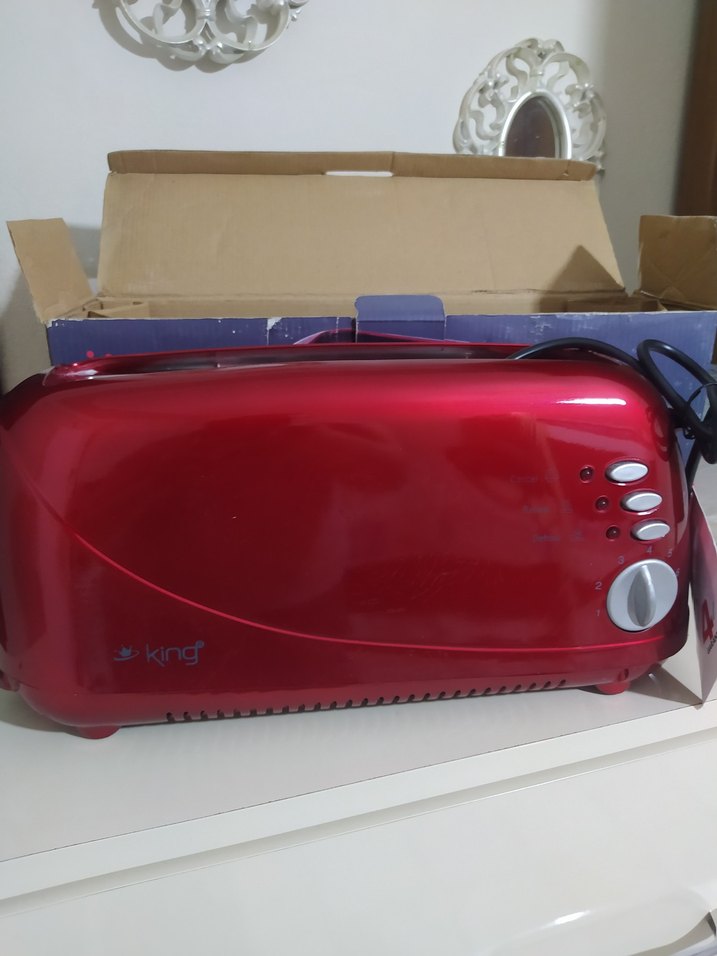 King K-192 Rosso ekmek kızartma makinesi, 220-240 V ve 730-870 W güçle çalışır, kırmızı ve gri renktedir. Made in P.R.C. sıfır üründür