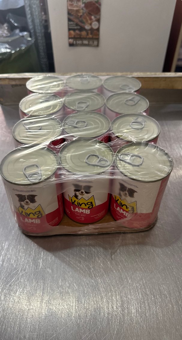 King markalı, kuzu etli 12'li konserve köpek maması paketi. Her kutu tazelik ve kolay kullanım için kapaklıdır.