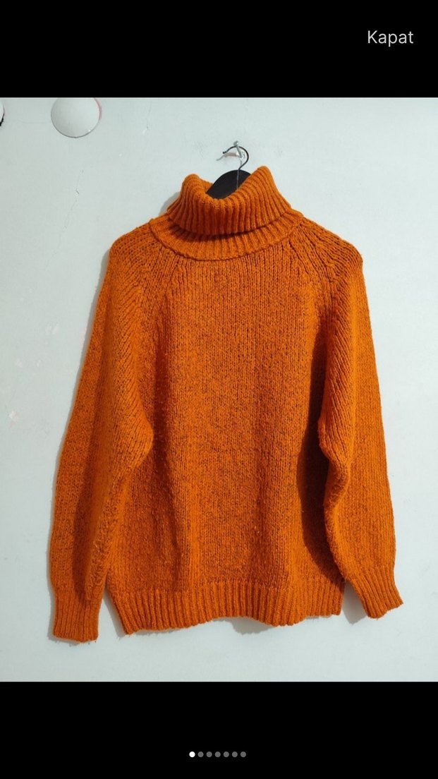 Bu kadın kazak, bol kesim ve örme dokusuyla boğazlıdır. Uzun kollu ve normal boydadır, günlük kullanım için uygundur. Düz ve canlı turuncu renktedir. Temiz sıkıntısız.