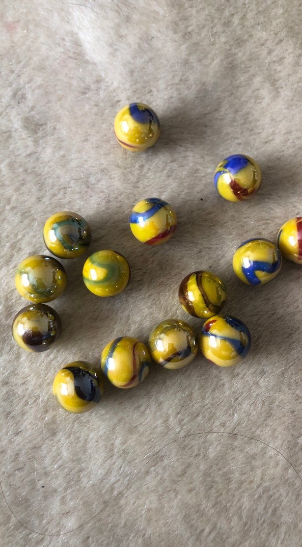 Sarı, mavi ve diğer renklerde canlı desenlere sahip renkli cam bilyeler seti. Koleksiyon veya oyun için uygundur.