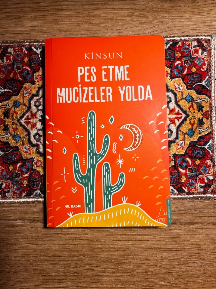 Kinsun imzalı "Pes Etme Mucizeler Yolda" şiir kitabı, azim ve umudu teşvik eden şiirler içerir. Parlak turuncu kapak üzerinde çöl ve ay çizimleri bulunur.