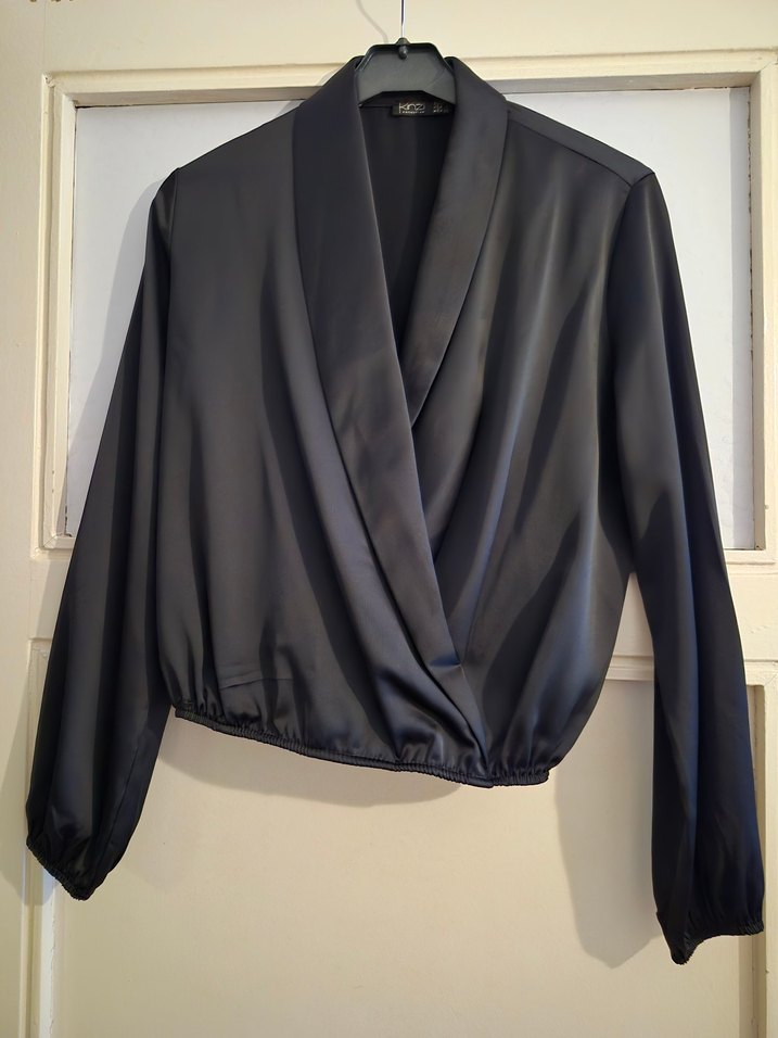 Siyah renkli, ipek görünümlü kumaştan, drapeli ve V yakalı, uzun kollu, bol kesim kadın bluz. Gece gündüz için uygun, çağdaş tarzda.