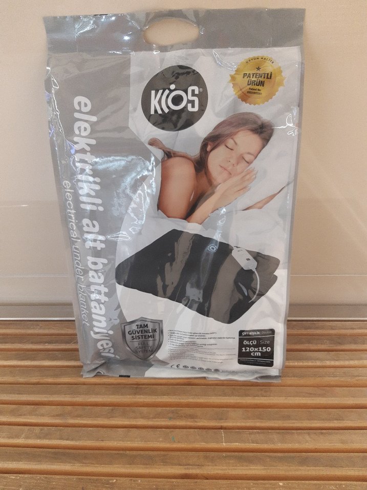 Kios elektrikli alt battaniye, gri renkte ve baskılı desene sahiptir. 120x150 cm ölçüsünde, tam güvenlik sistemi ve patentli kumanda içerir. sıfır ürün