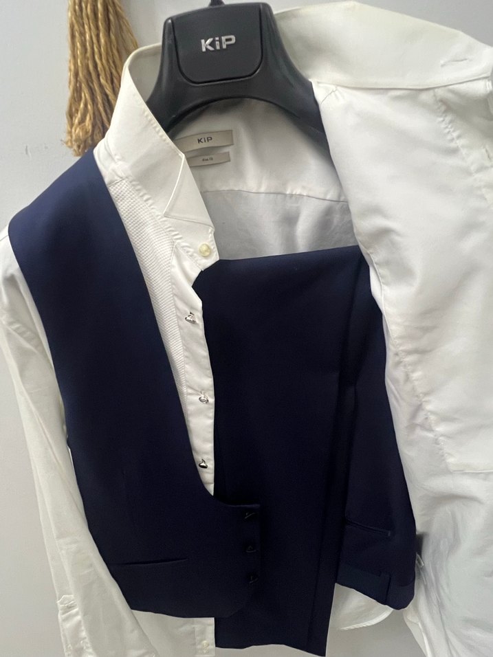 KiP markalı, kolsuz beyaz gömlek ve lacivert düğmeli yelek takımı. Normal boy, klasik kesim, iş ortamına uygun şık takım.