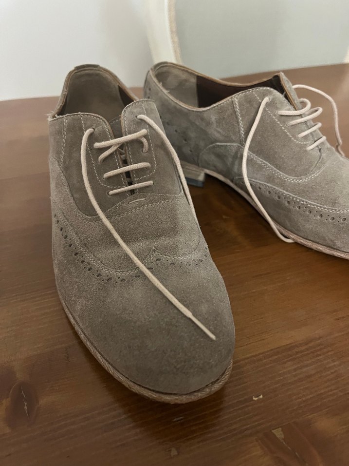 Gri süet malzemeden üretilmiş, bağcıklı ve desensiz erkek klasik ayakkabısı, günlük kullanıma uygundur.