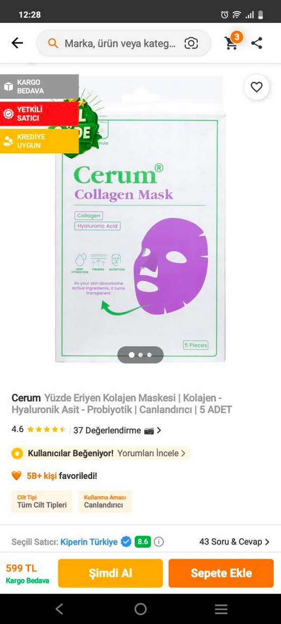 Cerum Kolajen Maskesi, hyaluronik asit ve probiyotik içerir. Cildi canlandırır ve nemlendirir. Paket içinde 5 adet, tüm cilt tipleri için uygundur.