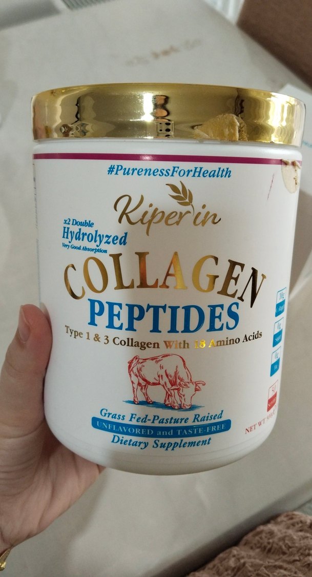 Kiperin hidrolize kolajen peptid tozu, 13 amino asit içeren tip 1 ve 3 kolajen içerir. Tadı yok, çimle beslenen hayvanlardan elde edilmiştir. 250 Gr. yarısı kullanıldı.