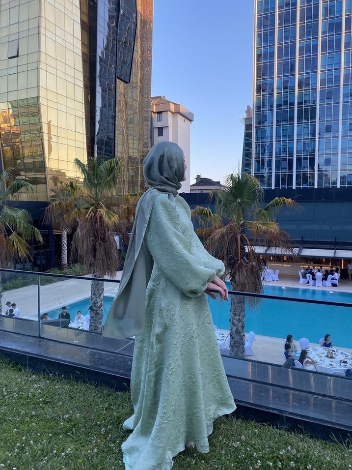 Pastel yeşil, uzun boy, yüksek yakalı ve uzun kollu, kuyruk detaylı abiye. Şalıyla beraber kiralayabilirsiniz.