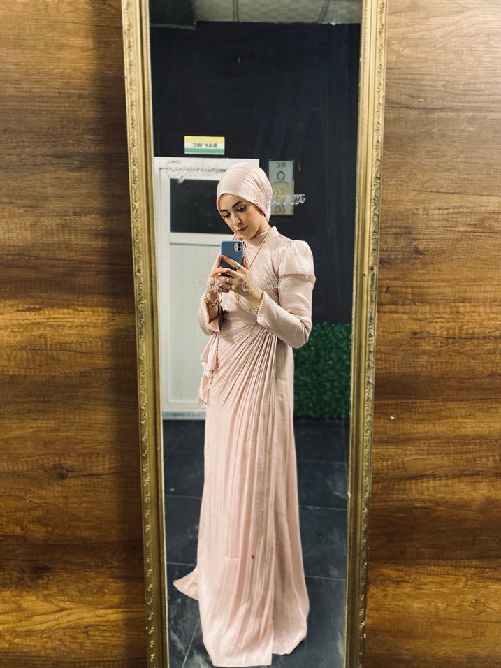 Pembe renkte, uzun kollu ve yüksek yakalı, ipeksi kumaştan yapılmış drapeli ve desenli uzun elbisedir. Düzenli kesim olup, sade ve mütevazı stil için uygundur. Aynı kumaş şalı da mevcuttur 42 beden 75 kiloya uygun