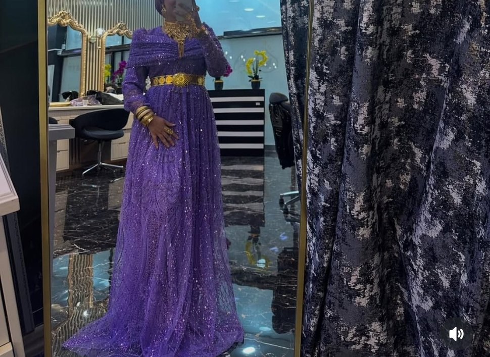 Parlak mor renkte, uzun kollu ve kayık yaka detaylı, bağlama deseniyle süslenmiş, drapeli bohem tarzda, düğünlere uygun klasik şıklıkta uzun elbise.