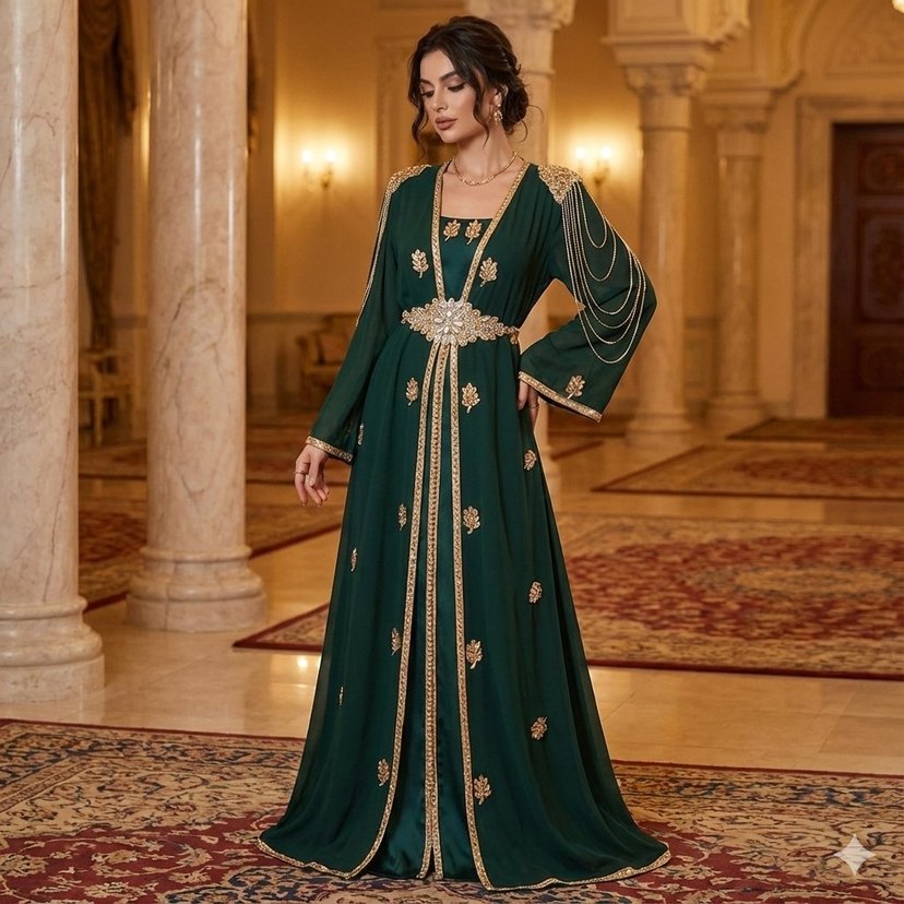 Bu koyu haki uzun kına elbisesi, V yakalı ve uzun kollu bol kesimdedir. İşlemeli ve boncuk detaylarıyla düğünler için şık bir tercihtir. Klasik zarafeti bohem dokunuşla yansıtır.